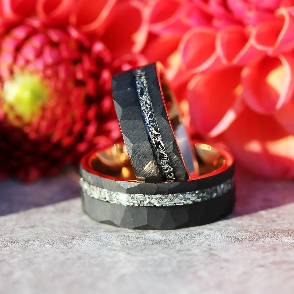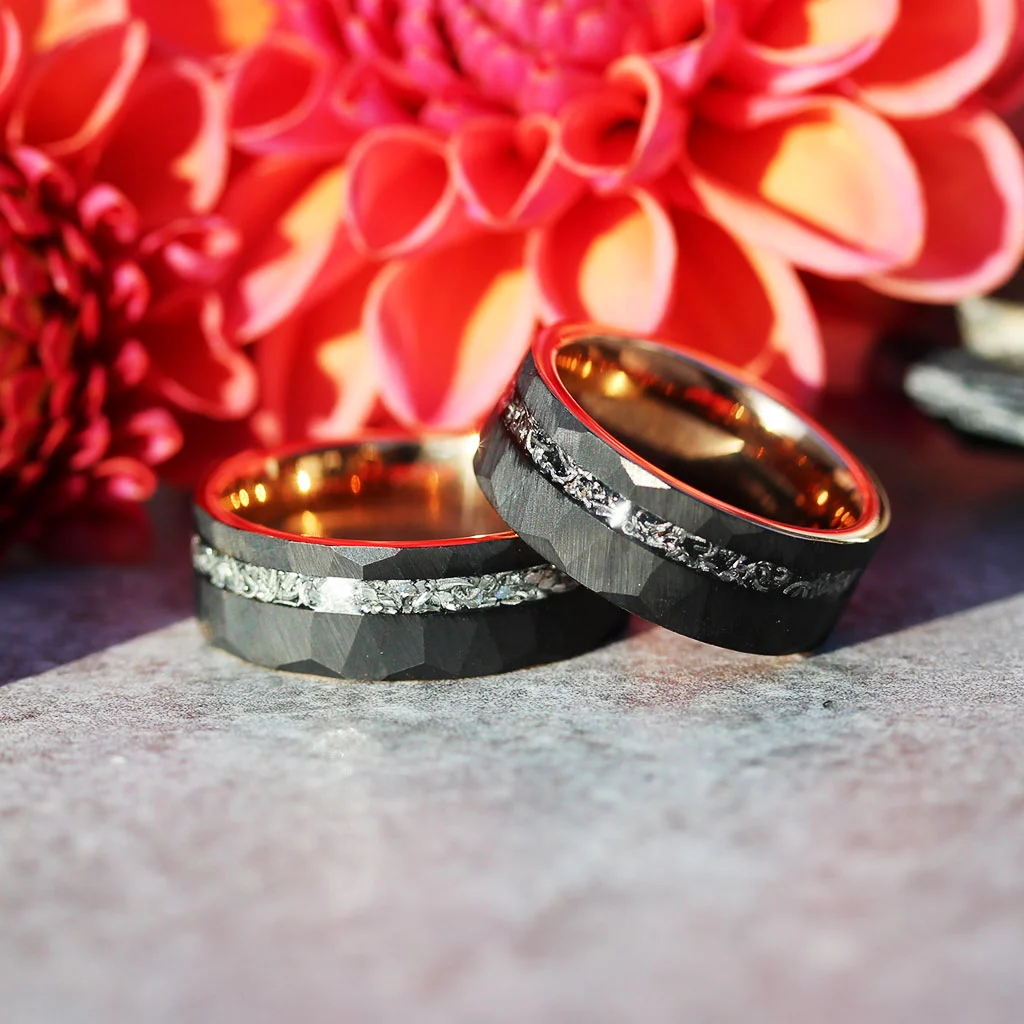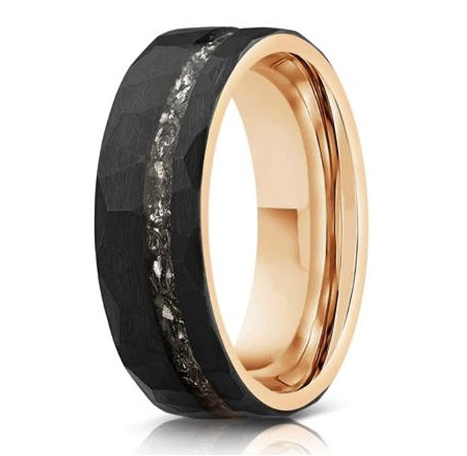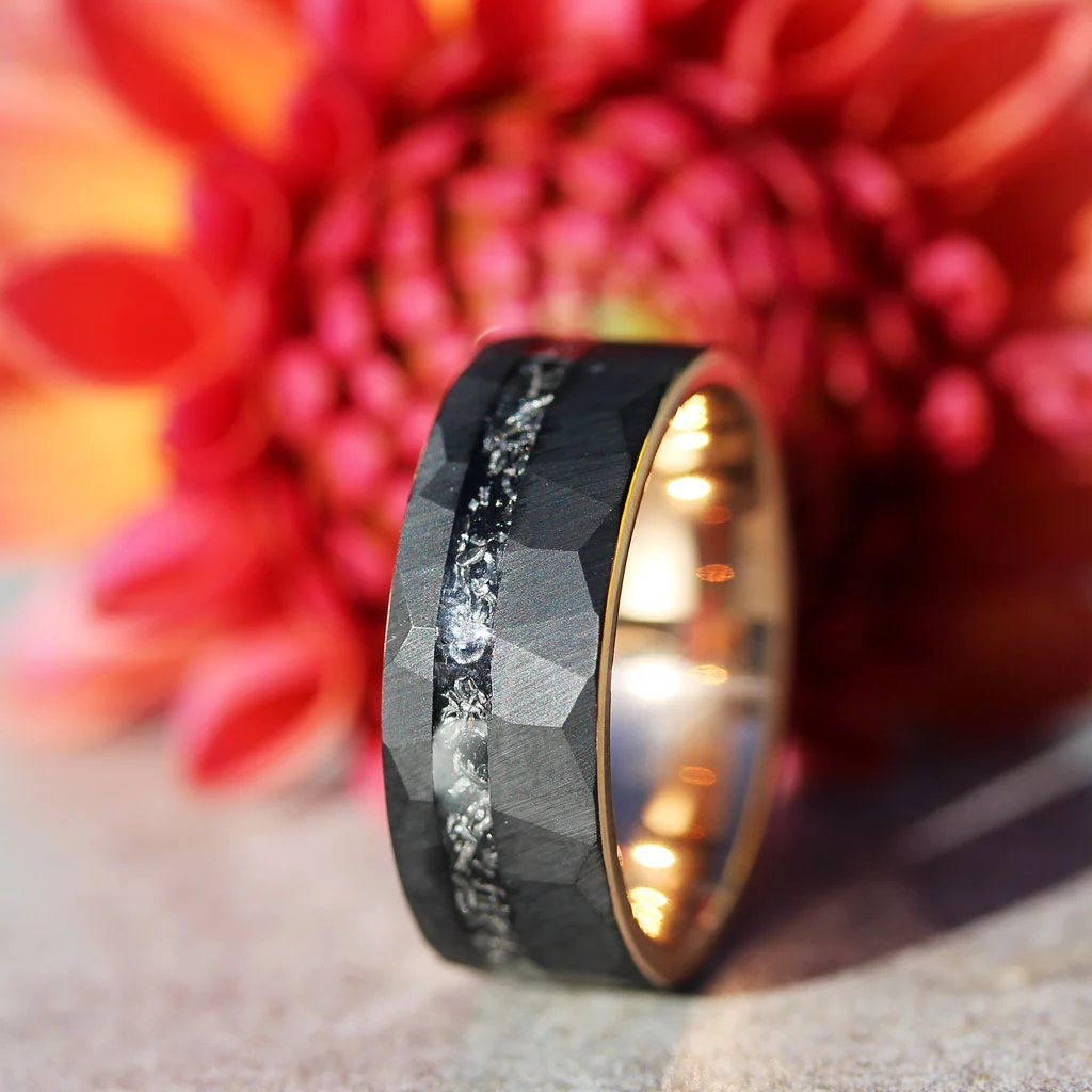 Nova Eclipse Rose Gold är en ring tillverkad i slitstarkt volfram (tungsten) med en bredd på 8 mm. Den har en mattsvart, facettslipad yta med ett exklusivt inlägg av meteoritfragment som ger ringen en modern och unik karaktär. Insidan är klädd i polerad roséguldfinish som skapar en elegant kontrast mot den mörka utsidan.